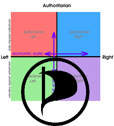Jag röstade pirat i EU-parlamentsvalet 7e juni 2009 Nyckeln till att kunna rösta pirat även i riksdagsvalet 2010, och i nästa EU-parlamentsval, ligger i att kunna förklara det skifte som redan har inträffat inom politiken både för våra egna väljare och för media (blogsfären såväl som di gamle). Skiftet jag pratar om är att det inte längre var det ekonomiska synsättet på politik som var den dominerande valfrågan för Piratpartiets väljarskara. Det här är inte första gången det är så (Miljöpartiet började likadant) men det kan bli, och måste bli, första gången den synen fortlever när partiet utvecklas. Det finns många förslag inom partiet just nu på hur det här ska kunna göras, men tyvärr ser jag inte många förslag som är mer konkreta än “sluta prata om det”. Det finns redan ett bra förslag - vi behöver bara i god Seth Godin anda sprida det till våra medarbetare/följeskara/väljare: The Political Compass Den vanliga vänster-höger skalan finns kvar i sin helhet i den här bilden av politiska yttringar, men en dimension till visas. Det är inte på något sätt en ny dimension, den har alltid funnits där i våra politiska värderingar - det är bara dags att göra den synlig. (För tydlighetens skull bör man även tänka sig den här axeln spänna över auktoritär till frihetlig, eftersom orden liberal/libertarian är värdeladdade både i svenska och engelska) Med den här bilden över politisk tillhörighet kan vi nu sätta svansen på åsnan: