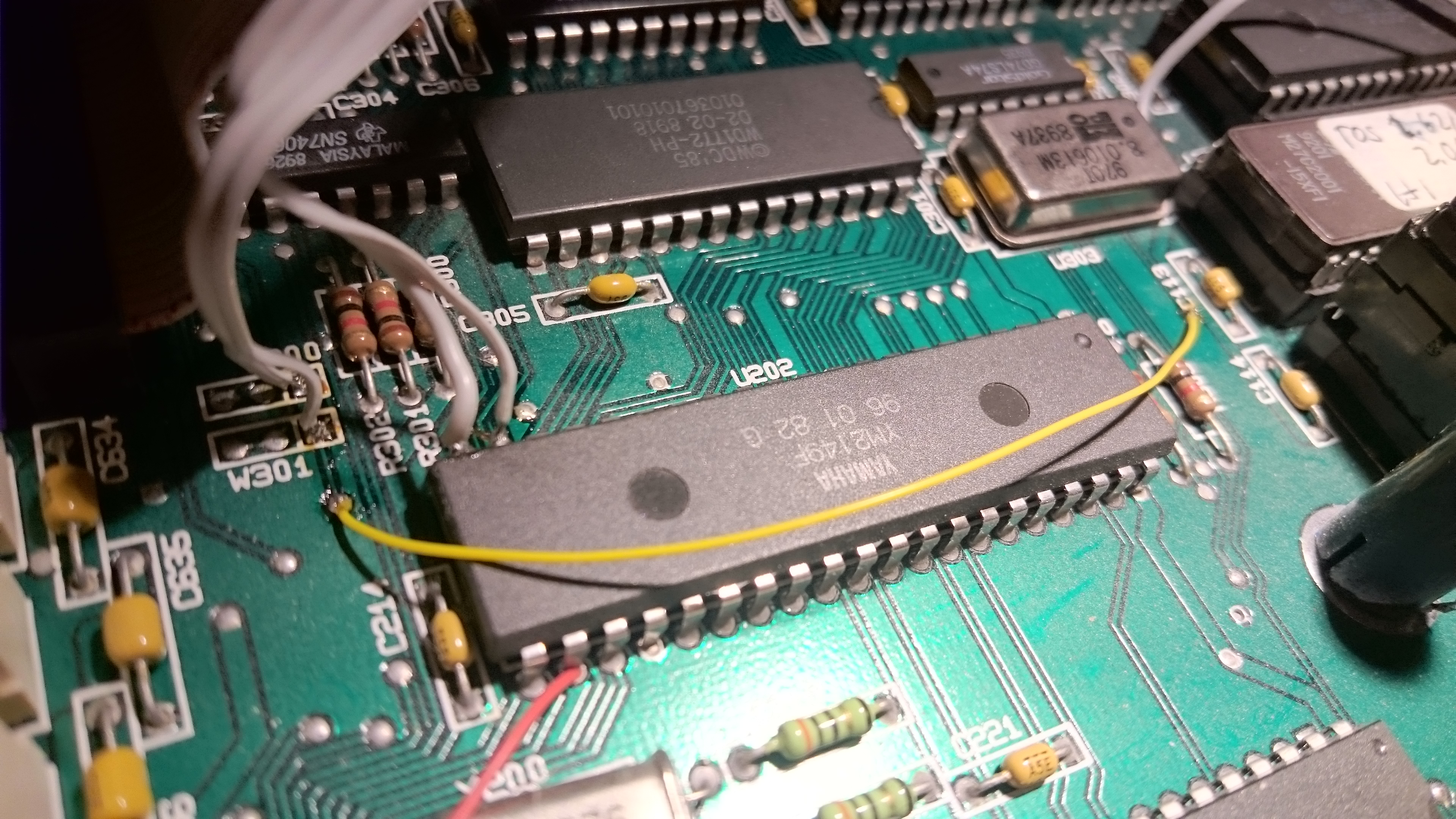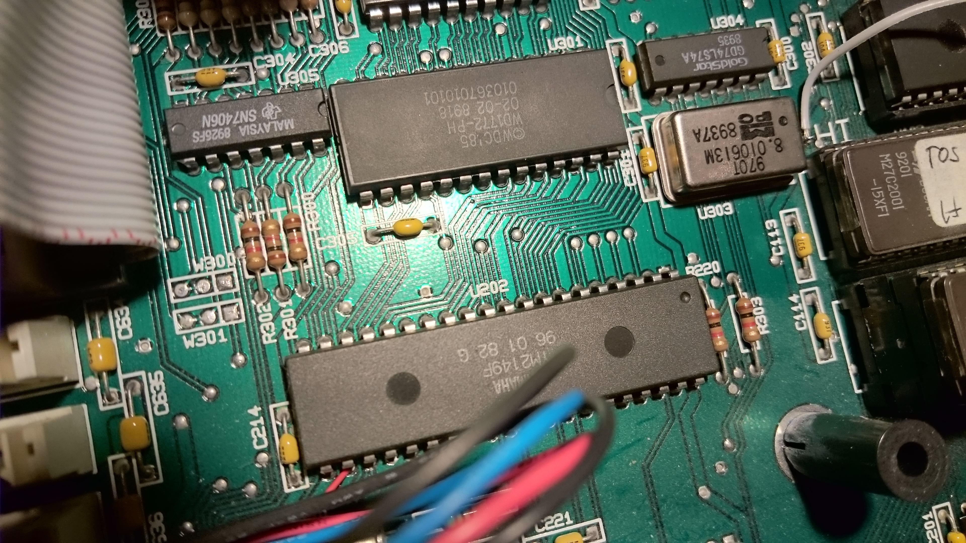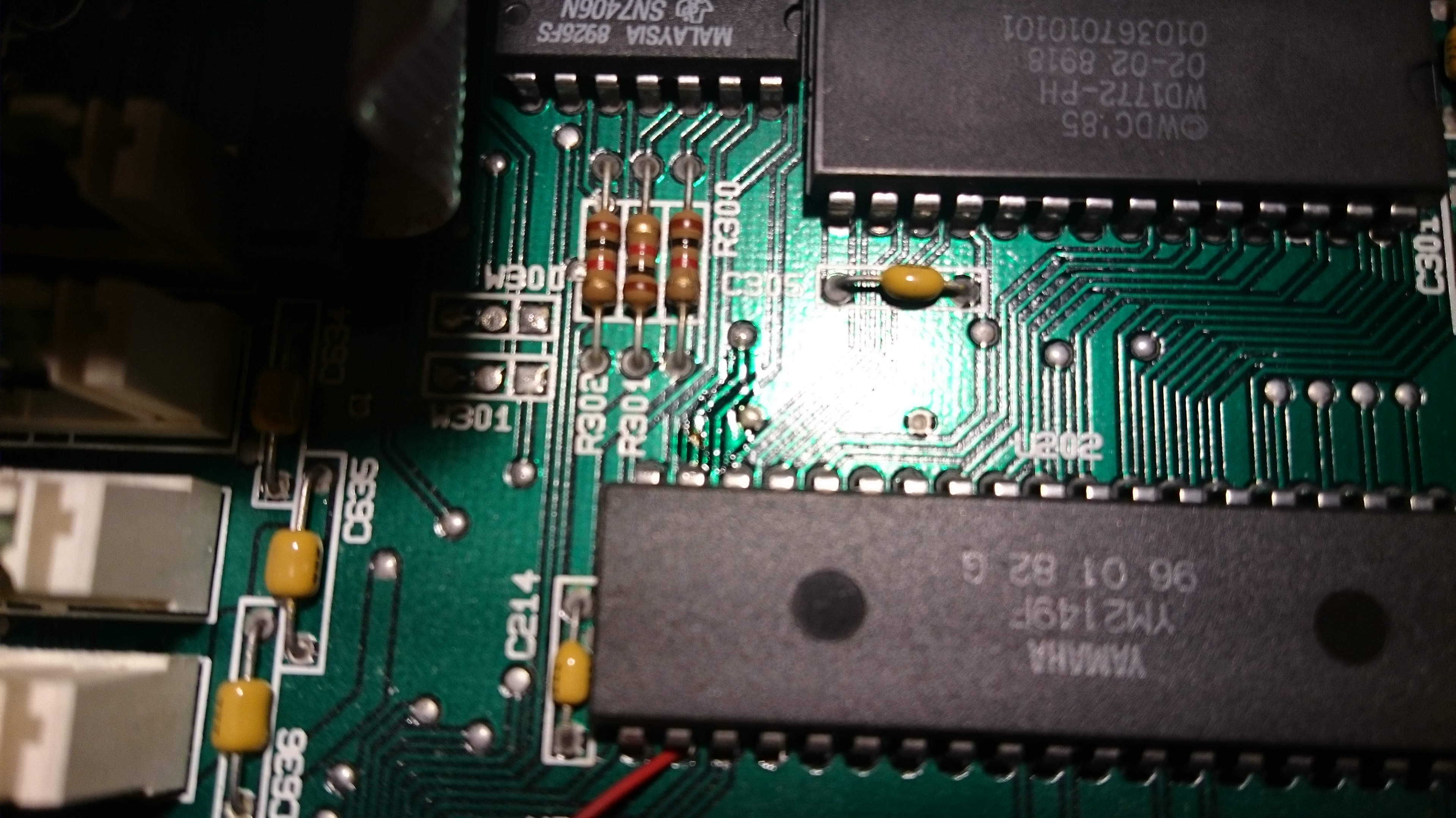 This is our area of interest - before any modifications have been done. Pin 20 and 19 of the YM 2149 soundchip are clearly visible (upper left of the chip from this angle) - and you can also see that pin 19 can be traced to a via. There’s no visible trace from pin 20 - leading us to conclude that it’s on the bottom side of the motherboard. Also note the three solder points named W300 and W301 respectively (square solder pad is pin 1 on each) - these are very much involved in what we want to do. DS1, pin 19, is available on W300-1 and DS0, pin 20, is available on W301-1. We see that W301-1 can be traced to a via just below it as well.