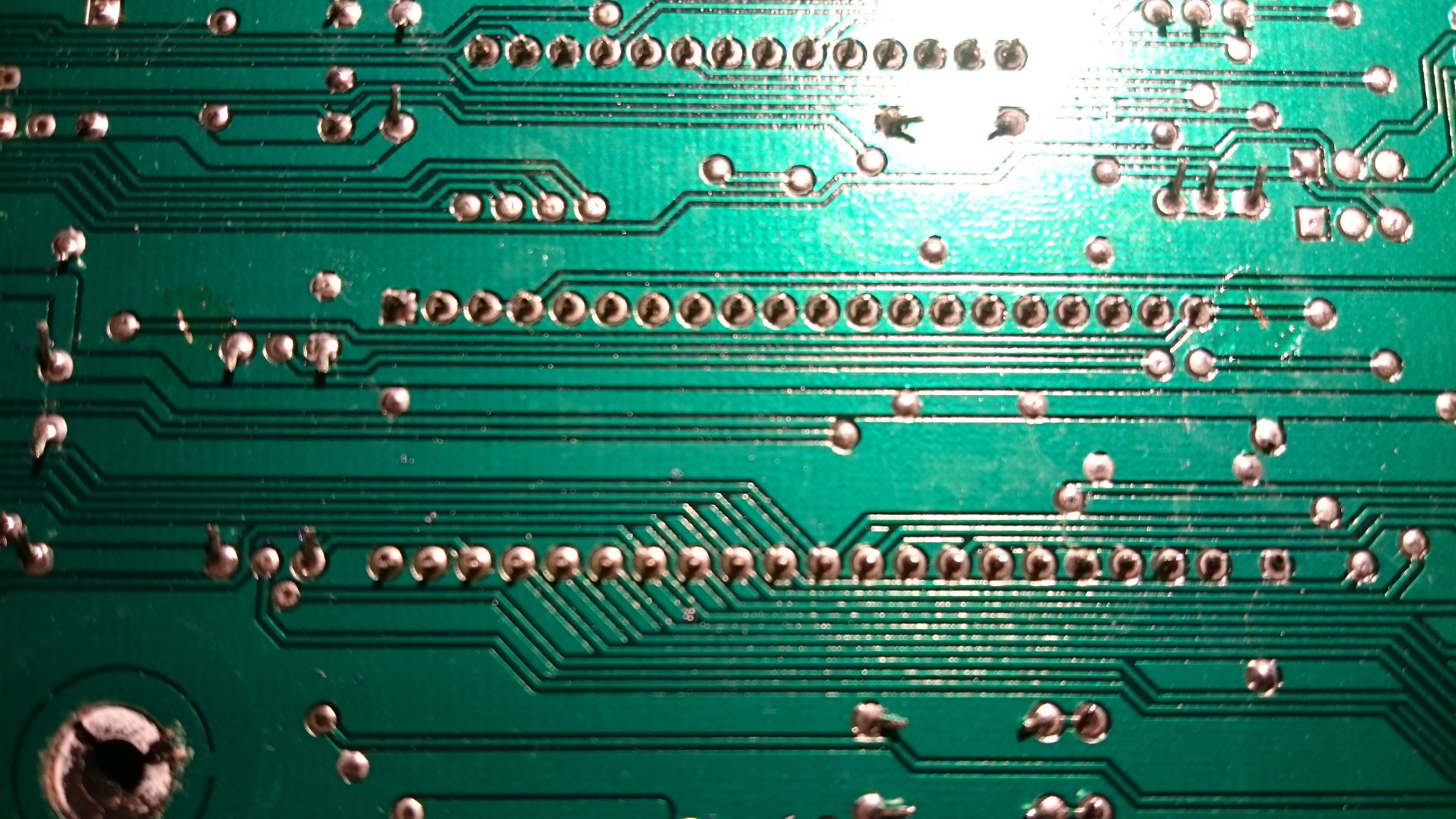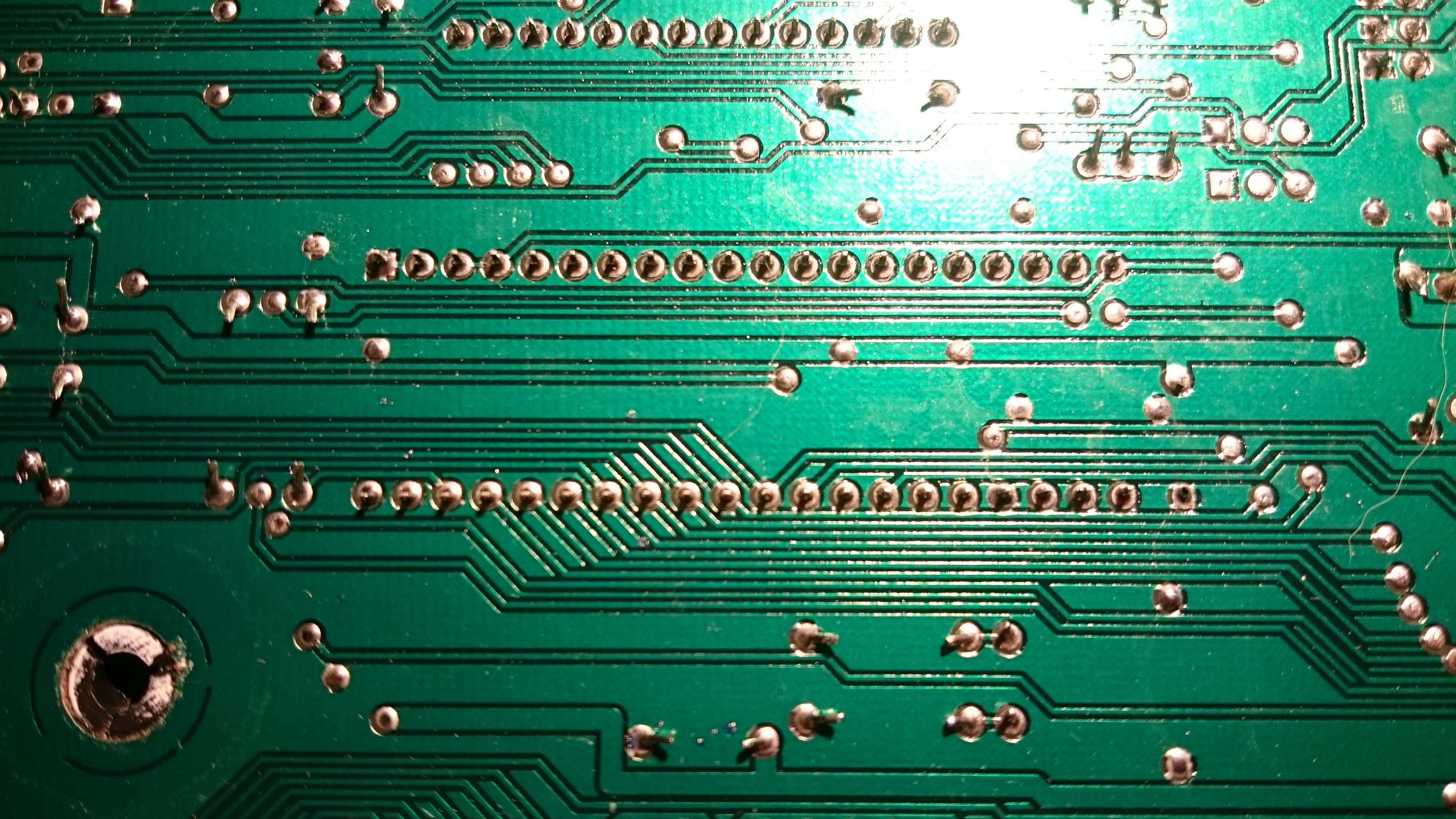 Turning over the motherboard we can see that pin 20 is indeed connected to the same via we just traced from W301-1 - but it’s also traced to another via on the other side of the chip! This second via is found topside at the ‘C’ in ‘C113’. With this knowledge we can now conclude that if we do not want to cut the actual pins 19 and 20 of the sound chip, we have a few cuts to make to traces on the motherboard. We must cut both traces originating from pin 20 on the bottom side of the motherboard, before the vias, as well as the trace to the via topside from pin 19.