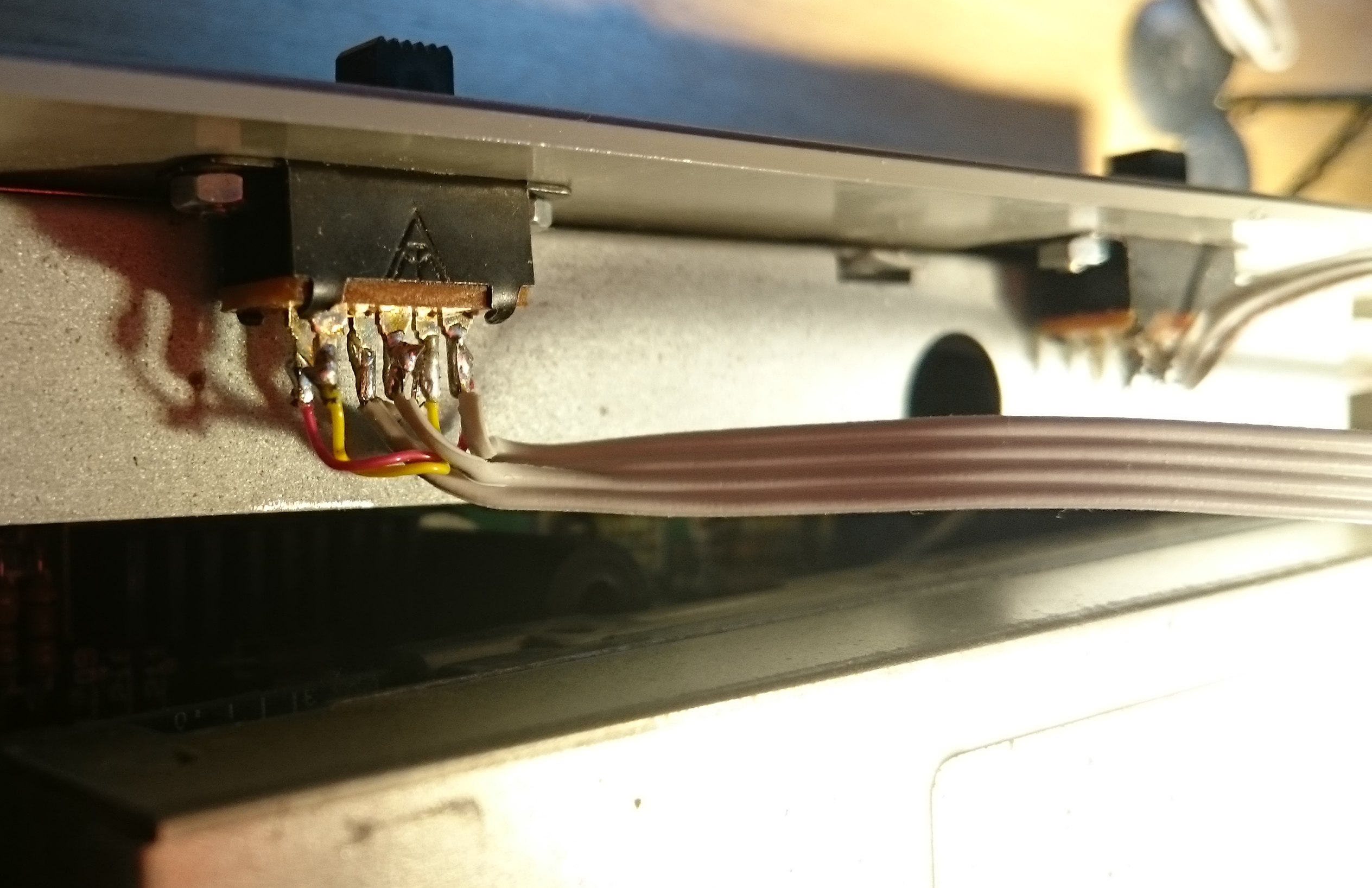 It’s retro computing time again! As part of my quite extensive rebuild of one of my Atari STE machines I want to have both an HxC SD floppy emulator as well as the original floppy disk drive mounted internally in the machine at the same time. While that in itself is just a question of making a cable that supports both, another problem quickly arises. In most cases you would want the machine to boot off the HxC (drive A:) and the internal floppy would then be drive B:. However, in some cases there’s clearly a point in booting off the internal floppy instead - and for that it has to be drive A:. In real Shugart floppy speak this amounts to the drive select signals, DS0 and DS1. On a modern ST both are available on the internal cable, and one (DS0) on the external. What we want is obviously to mount a switch that will swap these two signals at will. This is a solved problem. DS0 originates from pin 20 of the YM 2149 sound chip (really!) and DS1 is on pin 19. Cutting these two pins and then soldering two cables from the motherboard to the middle pins of a DPDT (dual pole, dual throw) switch and two cables from pin 19 and 20 to one side, crossed over to the other side, will do. It’s also possible to achieve a swap between an internal floppy and an external drive without cutting pins - some prefer to avoid that - but it won’t swap the two internal signals. Yesterday I really wanted to avoid cutting pins - but at the same time I needed a way to switch not only internal and external, but the two signals on the internal cable as well. I thus had to innovate a bit, and this post details the result. All pictures from a regular STE - I haven’t looked into what’s different on a regular ST or Mega model.