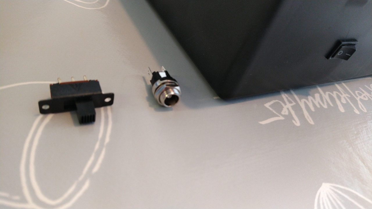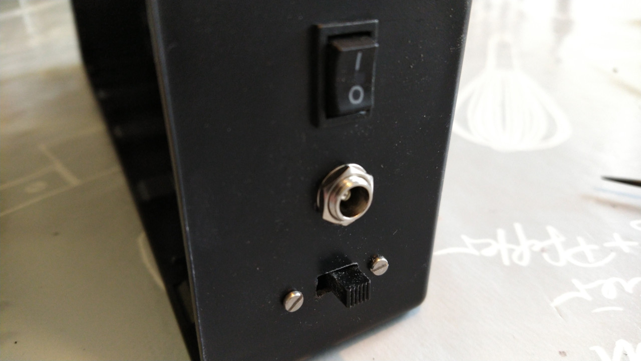 6st 1.5V batterier betyder att den drivs med 9V. Jag hade redan en sådan nätadapter liggande, annars kan de köpas från Kjell & Company, där jag även köpte honkontakten för chassimontage. Här kan man stanna, om man inte längre vill ha kvar möjligheten att använda batterier. Eftersom jag har gott om DPDT-switchar liggande var det dock inte mycket merjobb att lägga till möjligheten att växla mellan nät- och batteridrift.