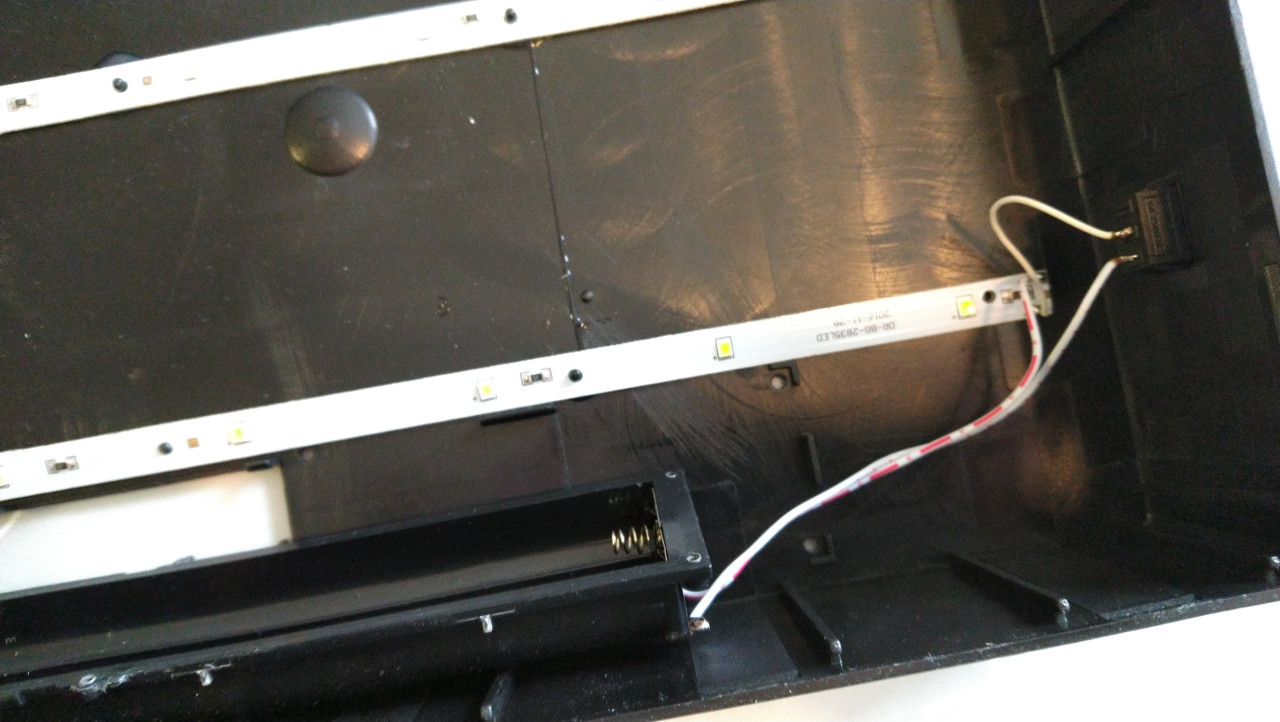 Efter att ha öppnat upp ljusboxen (den är knäppt på, använd en flat skruvmejsel och bänd försiktigt tills du lyckats lyfta upp en kant. Skruvarna på baksidan håller enbart fast batterihållaren och behöver inte tas bort) så ser vi snabbt att konstruktionen är väldigt enkel. Batteripacket är kopplat minus direkt till LED-slingan, och pluspolen går via strömbrytaren.