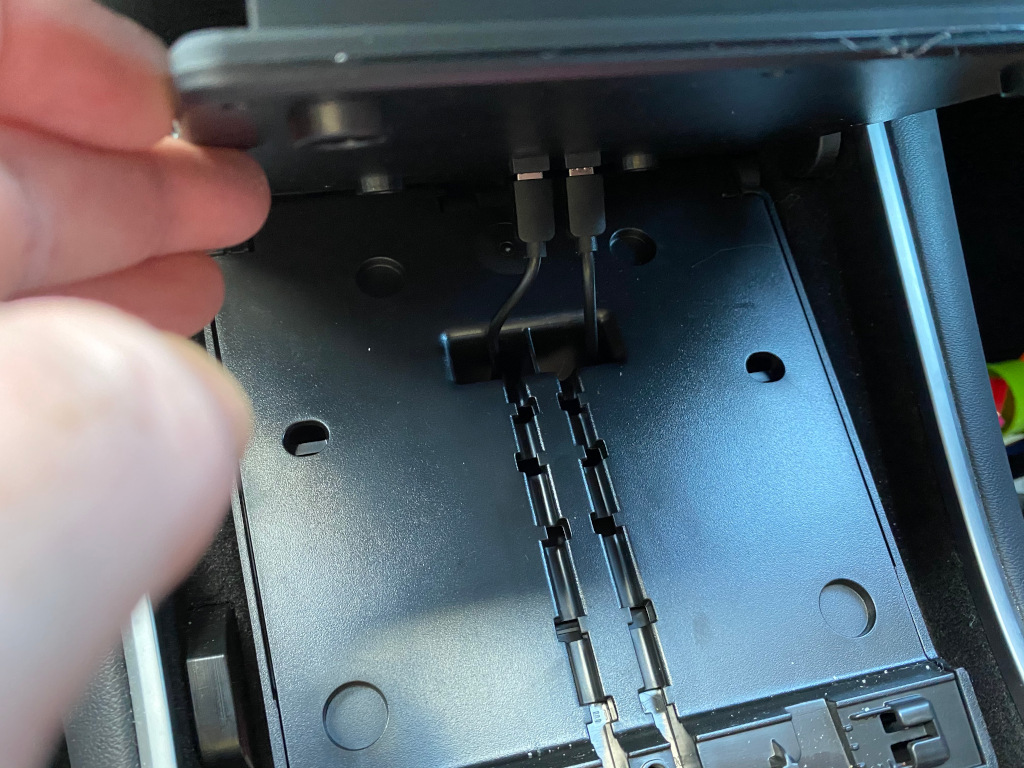 The new charger plate with its USB power cables fitting the stock holes down into the compartment.